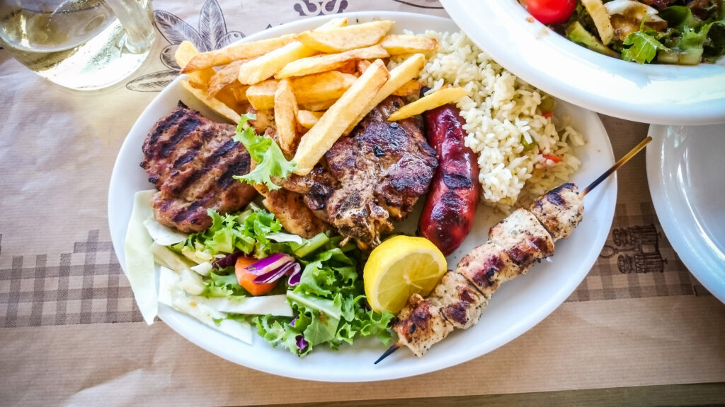 Gyros, 2 Souvlaki, 4 Souzukakia, eine Portion Pommes, Tzatziki und ein großer Bauernsalat -